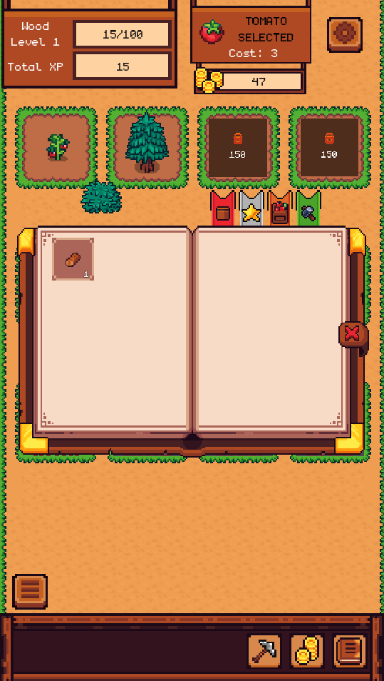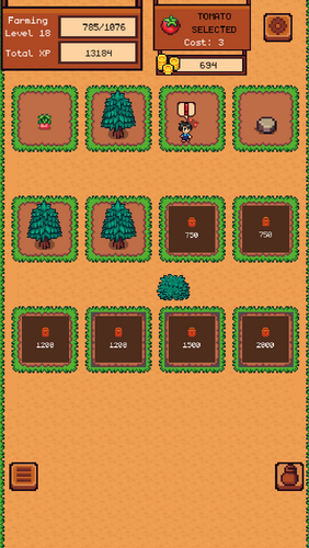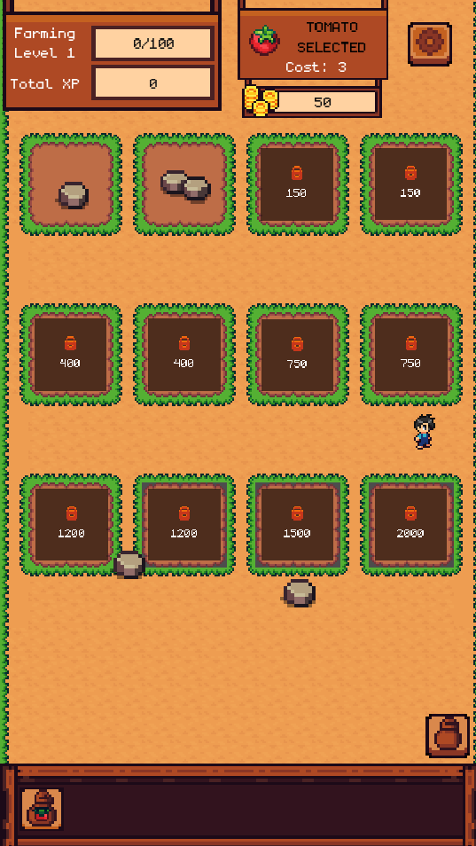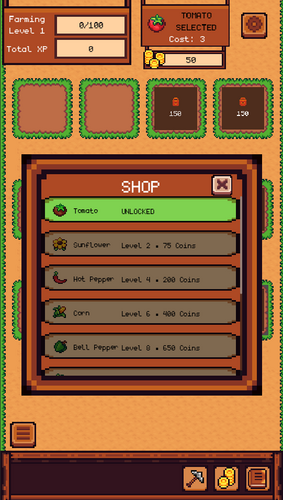 Start your journey with tomatoes. As you reach farming milestones, you will unlock new seeds with different growth times and values. Use the resources gathered from your land to unlock more plots and upgrade your equipment.